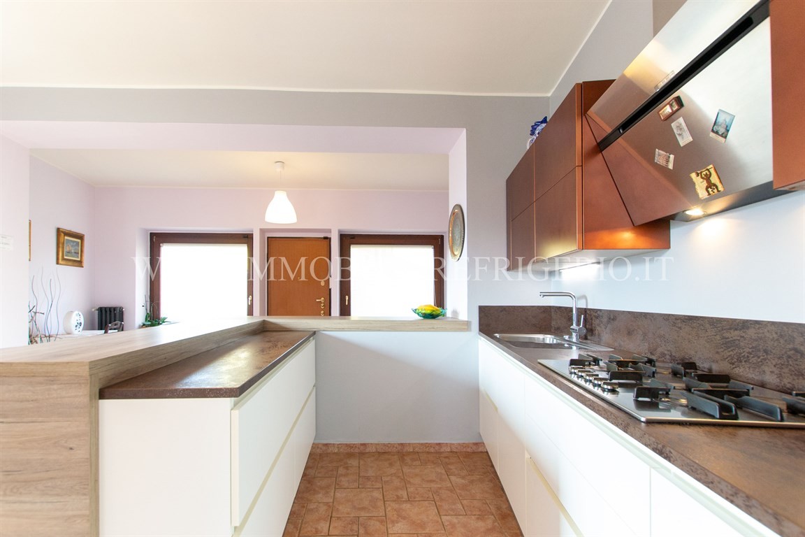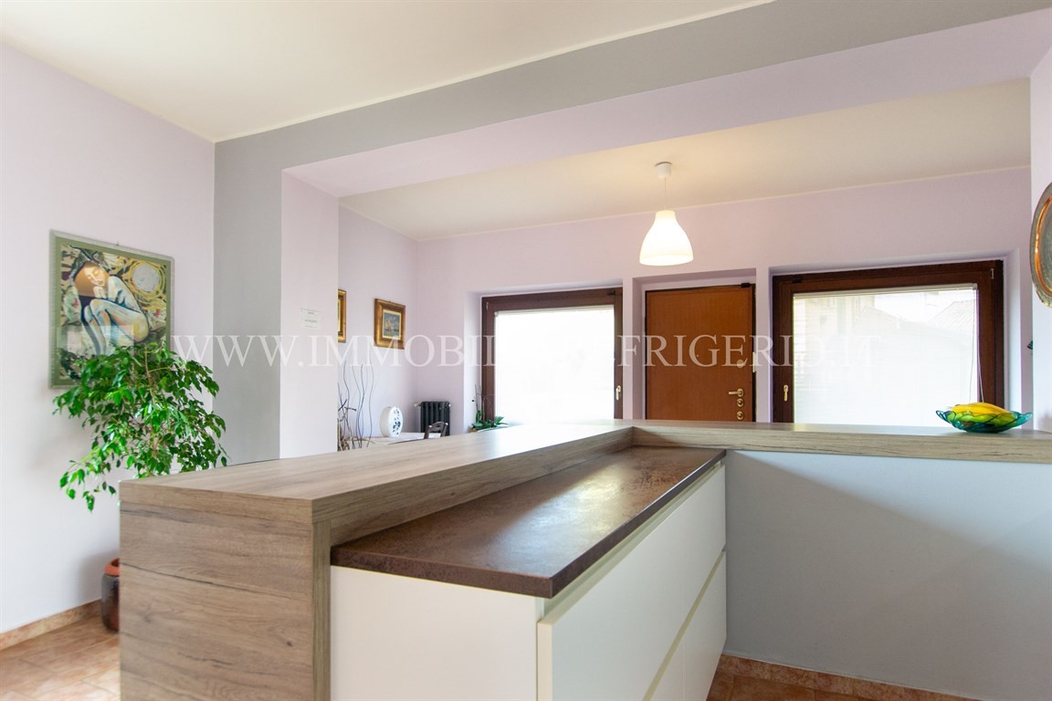 L’ingresso conduce in una luminosa zona giorno open space con cucina moderna e funzionale, zona pranzo e accogliente angolo relax con stufa a legna, perfetto per creare un’atmosfera calda e conviviale.