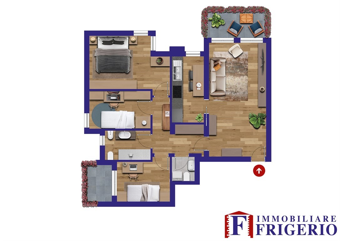 L’ingresso si apre direttamente sul soggiorno con accesso al terrazzo panoramico, mentre la cucina è separata e abitabile. La zona notte è composta da tre camere da letto e da un bagno principale, completamente ristrutturato due anni fa, oltre a un secondo servizio ad uso lavanderia.