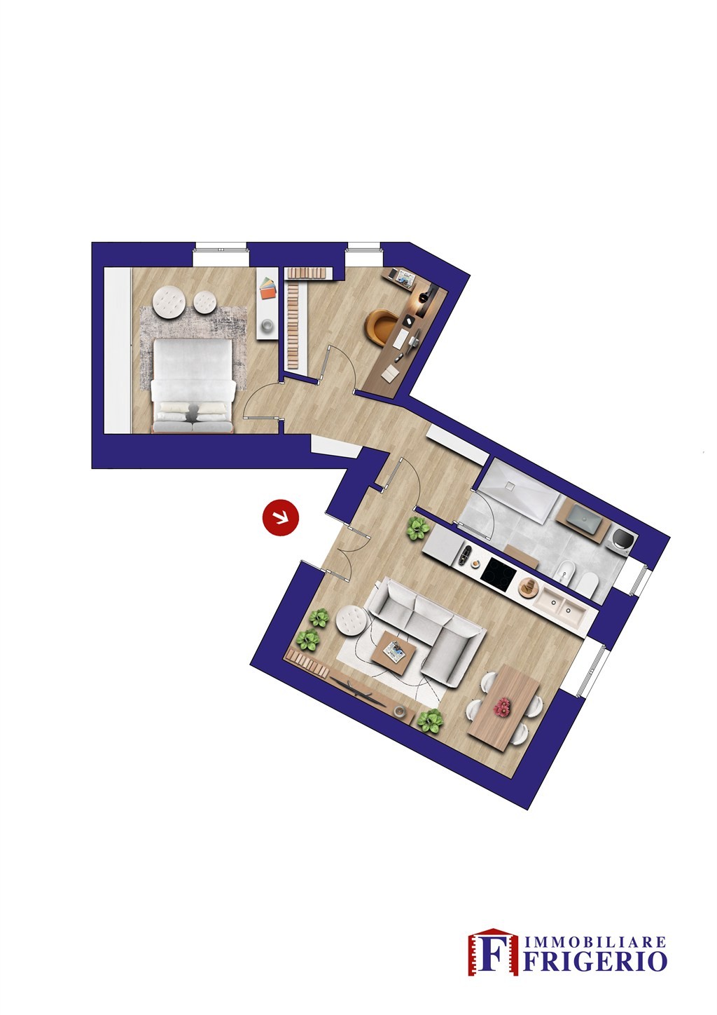 L’immobile è composto da soggiorno con angolo cottura, disimpegno, camera da letto, bagno e ulteriore locale utilizzabile come studio o cameretta.