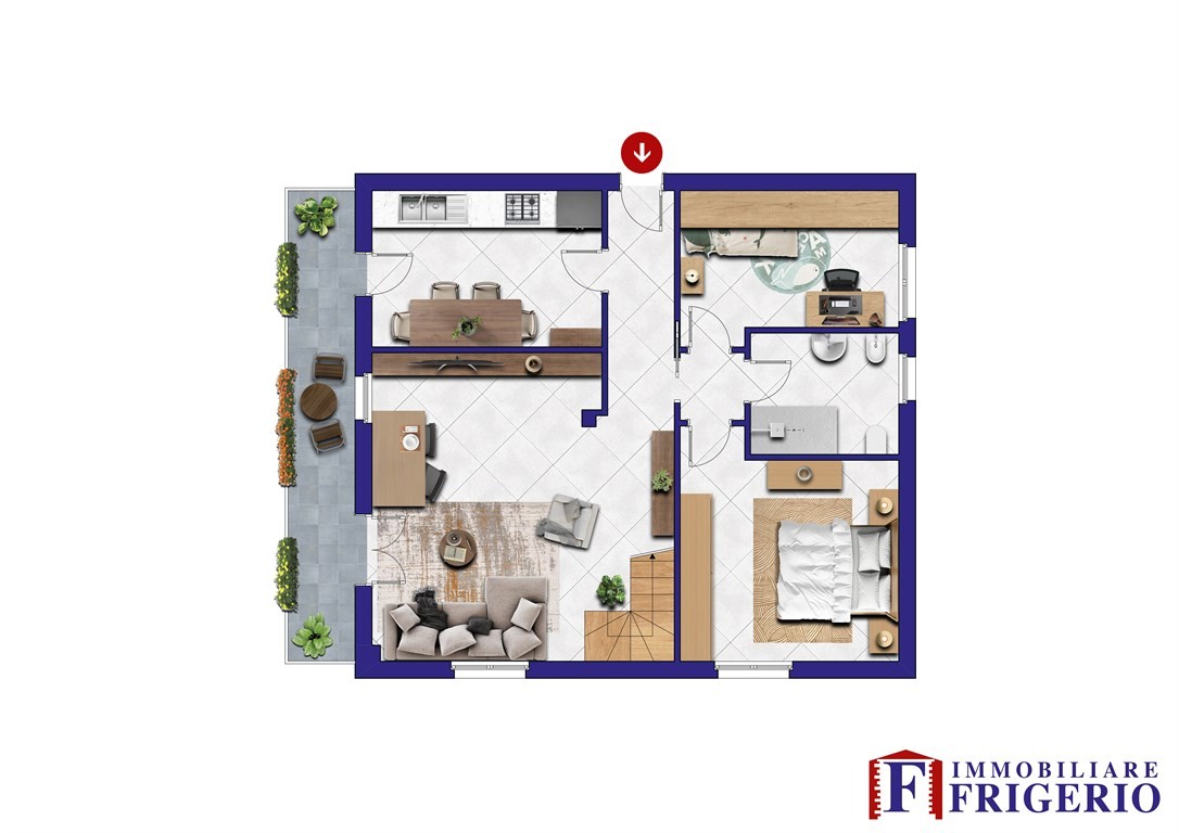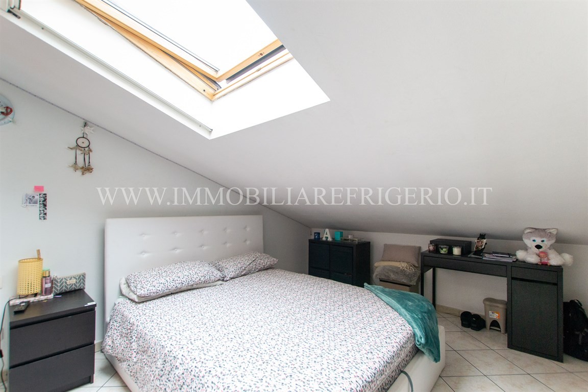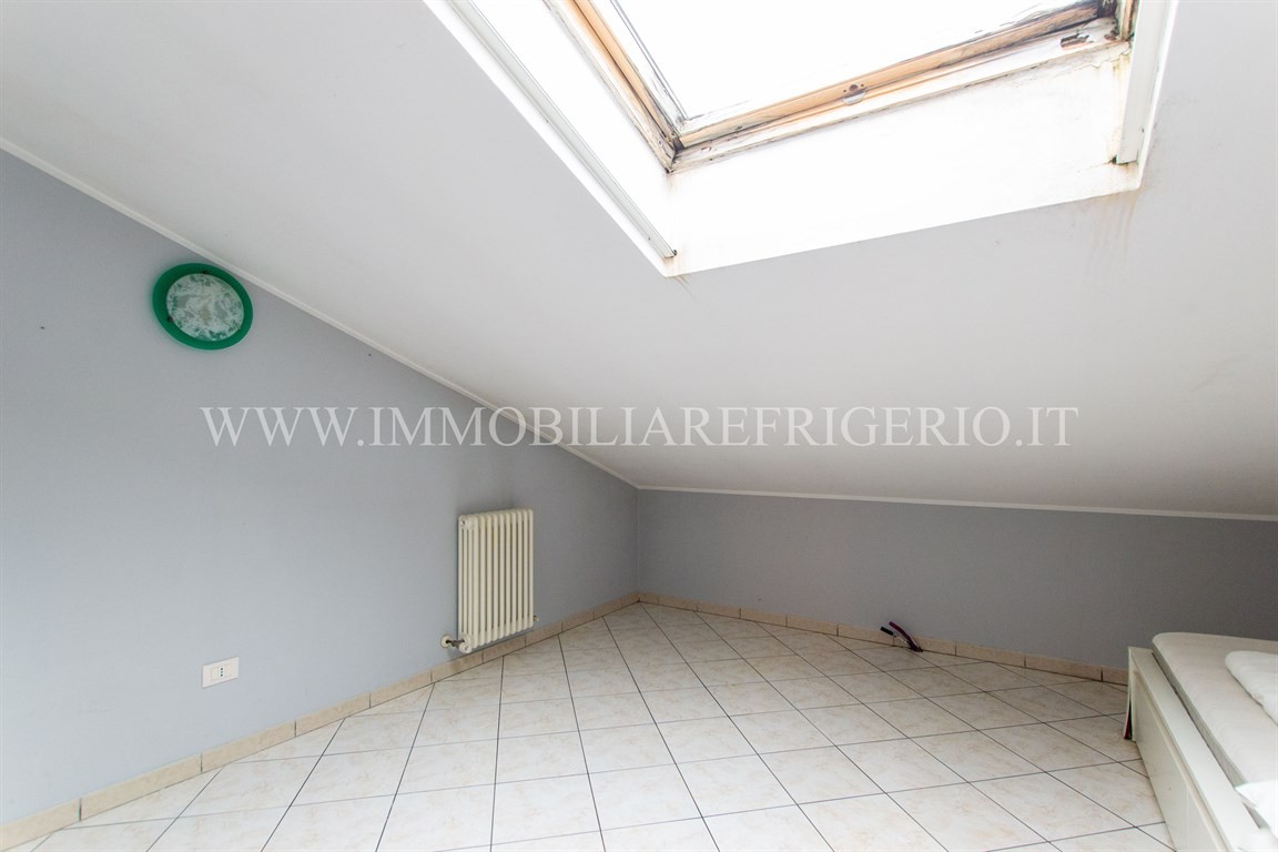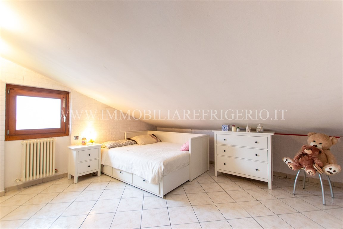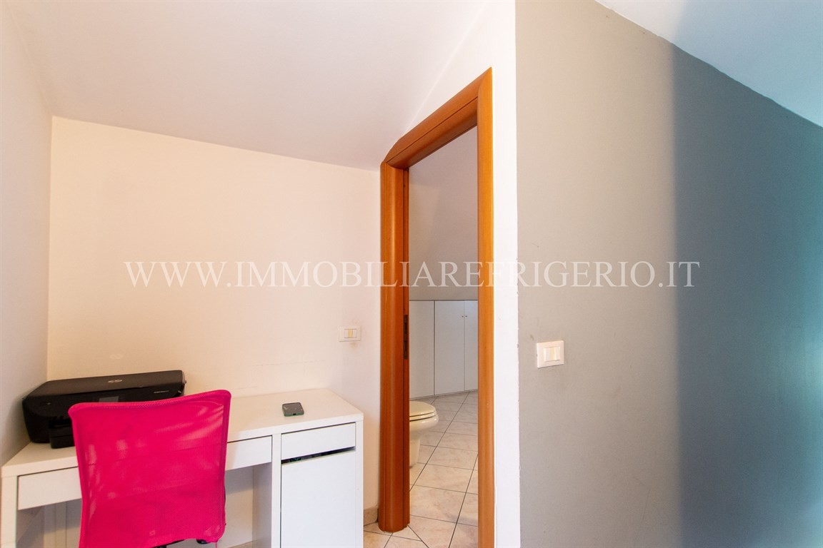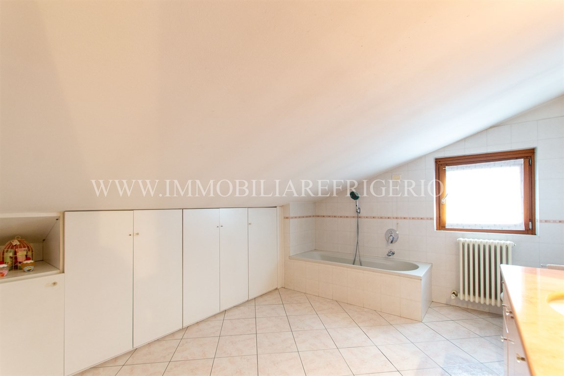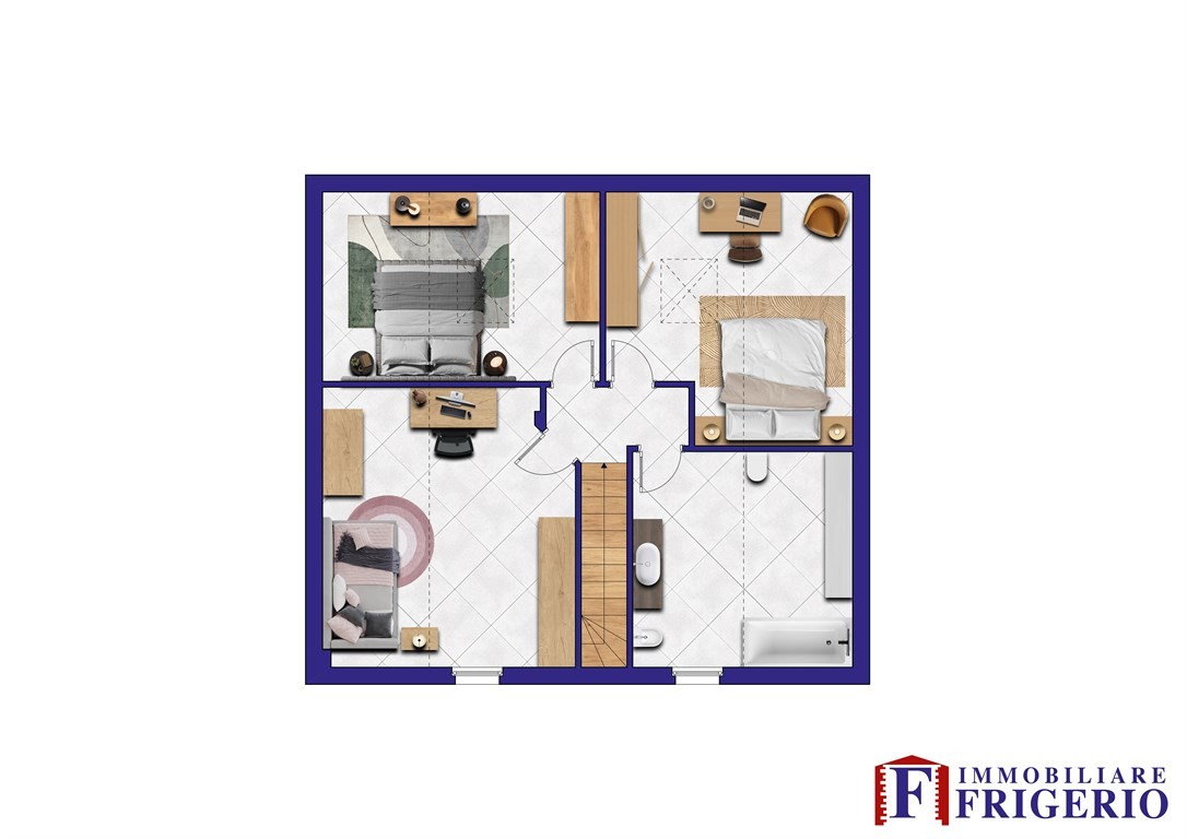 Una scala interna collega il soggiorno al piano superiore, che offre un’ulteriore superficie di pari metratura, composta da tre locali mansardati e da un secondo bagno, ideale per creare spazi personalizzati come studio, area relax o camere aggiuntive.