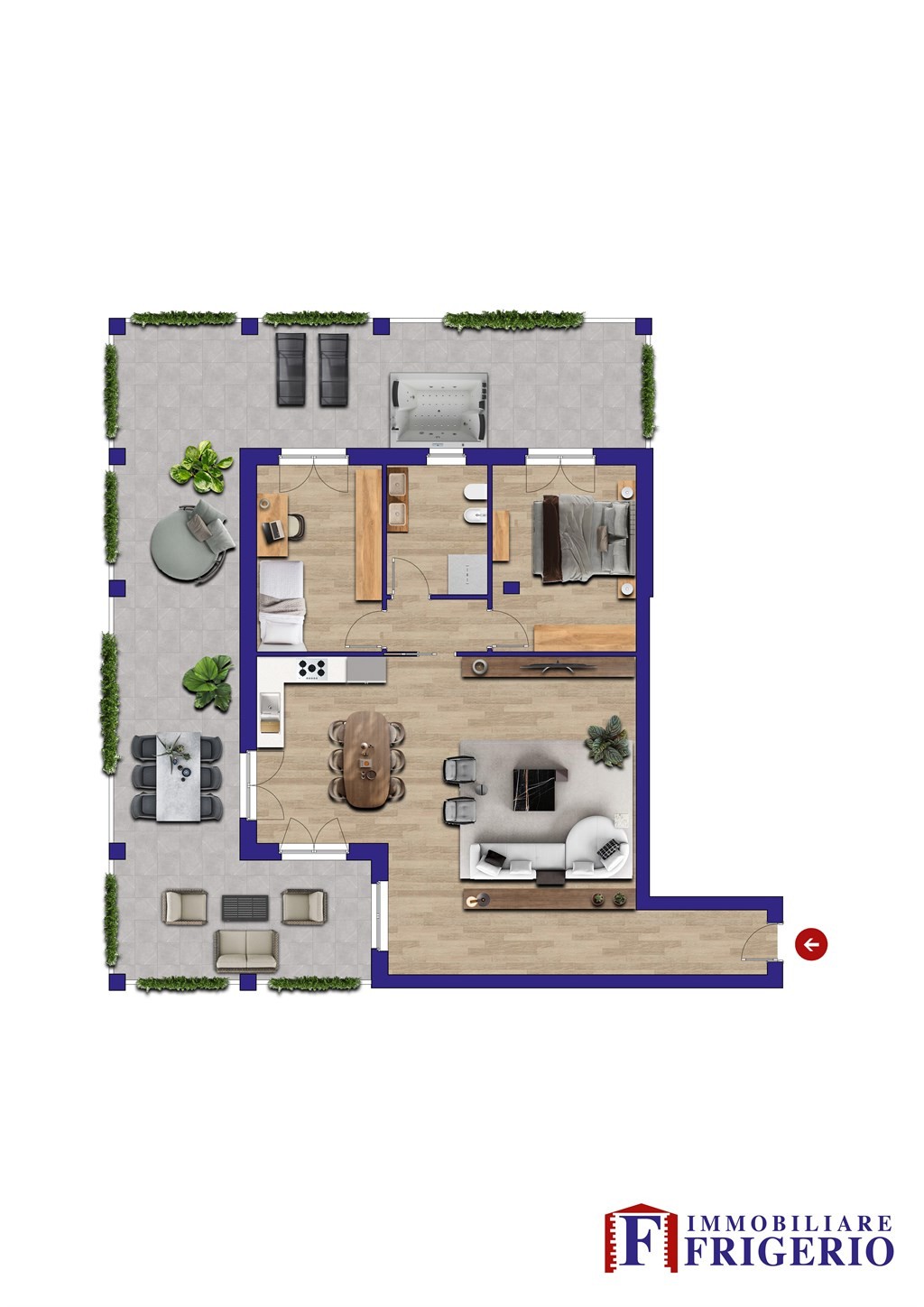 L’appartamento, progettato per garantire comfort e luminosità, si compone di una zona giorno open space con soggiorno e cucina a vista affacciata direttamente sul terrazzo, disimpegno, bagno finestrato con doccia e due camere da letto, entrambe con accesso diretto all’area esterna.