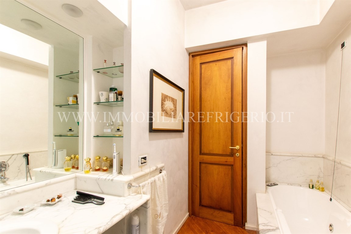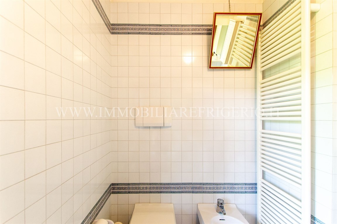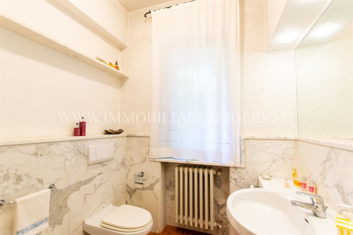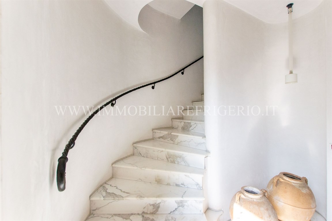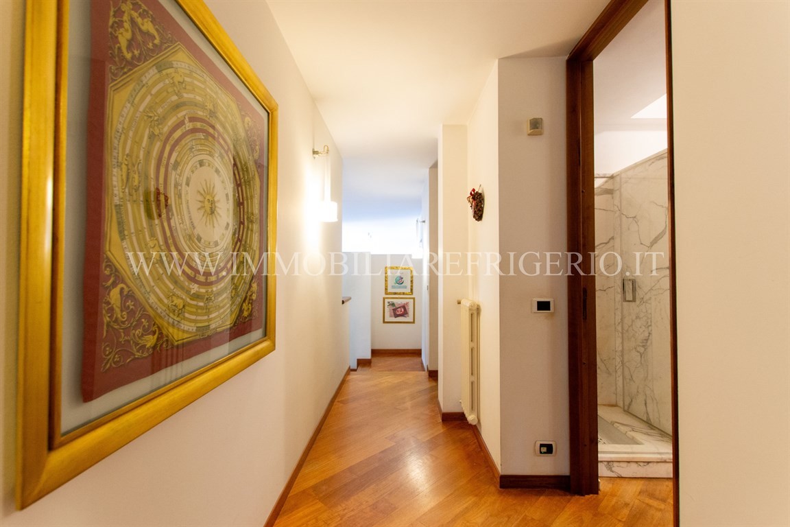 Ogni dettaglio racconta la qualità della ristrutturazione: i pavimenti in Tec nella zona giorno, Cotto a mano smaltato in cucina, Travertino di notevole fattura in taverna, i bagni in Marmo bianco di Carrara, lo stesso marmo che riveste l’elegante ingresso e la scala di collegamento al piano superiore. Gli infissi in legno di Rovere con doppio vetro e le persiane, anch’esse in Rovere.